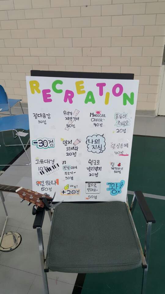 토요일 레크리에이션 시간에는 성아람 자매님과 박병건 집사님의 인도 하에 재미있는 게임들이 많이 진행되었는데요!