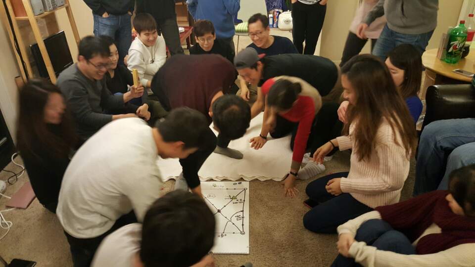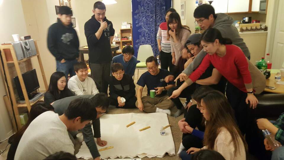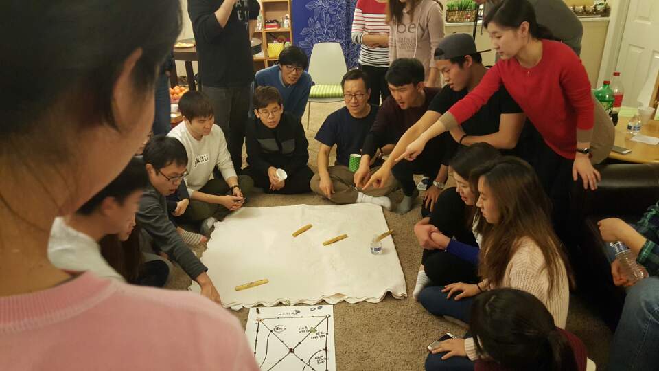 맛있는 저녁밥과 후식을 먹은 후, 소화시킬 겸 윷놀이를 했습니다!